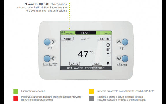 EXCLUSIVE X è dotata di una nuova interfaccia evoluta, che costituisce l’intelligenza del sistema ibrido della caldaia. La nuova gamma nasce infatti HYBRID READY, con la possibilità cioè di gestire direttamente sistemi multi-energia, attraverso l'interfaccia della caldaia, senza controlli remoti esterni. Elegantemente coperta da uno sportellino logato Beretta, la nuova interfaccia è caratterizzata da un display LCD retroilliuminato a colori, che comunica con utenti e/o installatori utilizzando testi e icone. Attraverso 4 tasti è possibile navigare il display in maniera semplice e intuitiva, accedendo a tutte le impostazioni e parametrizzazioni della caldaia e del sistema. L’autodiagnostica evoluta, unitamente alle funzioni EXCLUSIVE X attivabili dall'interfaccia, ne completano il profilo innovativo.