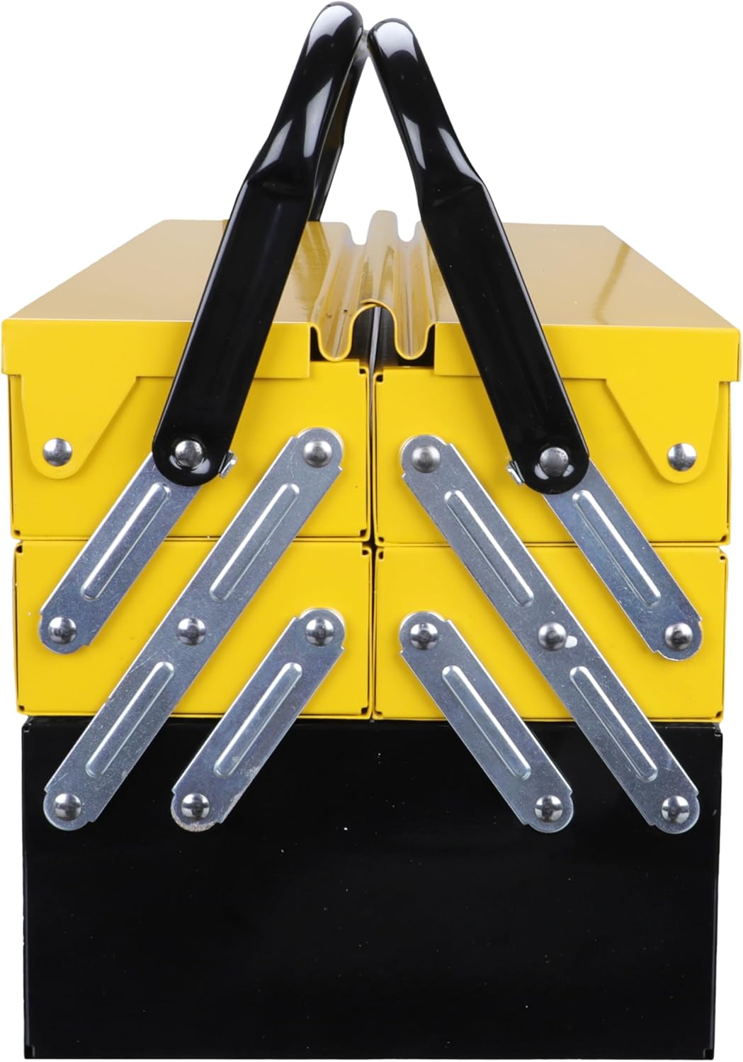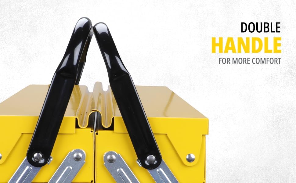 Cassetta portautensili a 5 scomparti; due manici che consentono l'accesso totale negli scomparti; dimensioni: 20.8 x 20.8 x 46 cm.