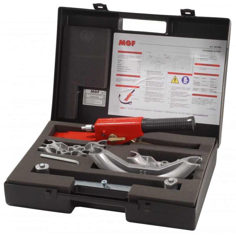 Curvatubi ALPEM per tubo multistrato da 16-20-26-32. Piegatubi per multistrato ALPEM, per tubi fino a 32 mm. In cofanetto con matrici. La curvatubi più robusta con cricco e senza olio. Sistema di riduzione meccanico, curva agevole fino a Ø 32 e assenza di manutenzione e perdite d'olio; dentatura fitta della cremagliera, avanzamento graduale per curve precise; ritorno automatico a molla; Curva con una mano, veloce e semplice; una sola contromatrice per tutti i diametri, pratica da usare e non si perdono le contromatrici; matrici in alluminio, ottimizzate per curvare il multistrato, garanzia di tenuta e affidabilità del tubo anche dopo la curva;