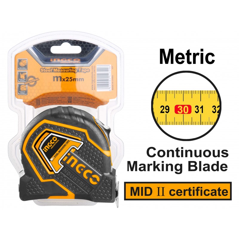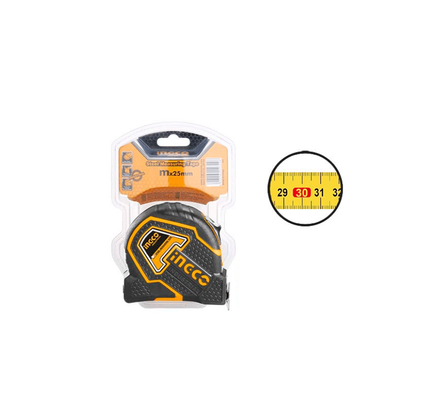 Rotella metrica da entrambi i lati del nastro; lunghezza 5 mt; larghezza nastro 19 mm; gancio extra large; rivestimento completo in gomma antiscivolo che lo protegge dagli urti e permette una presa ferma. Nastro in acciaio rivestito in nylon antiriflesso, anticorrosione ed antiusura; bloccaggio a pulsante con ritorno automatico del nastro; dotato di gancio metallico per cintura e laccetto in tessuto.