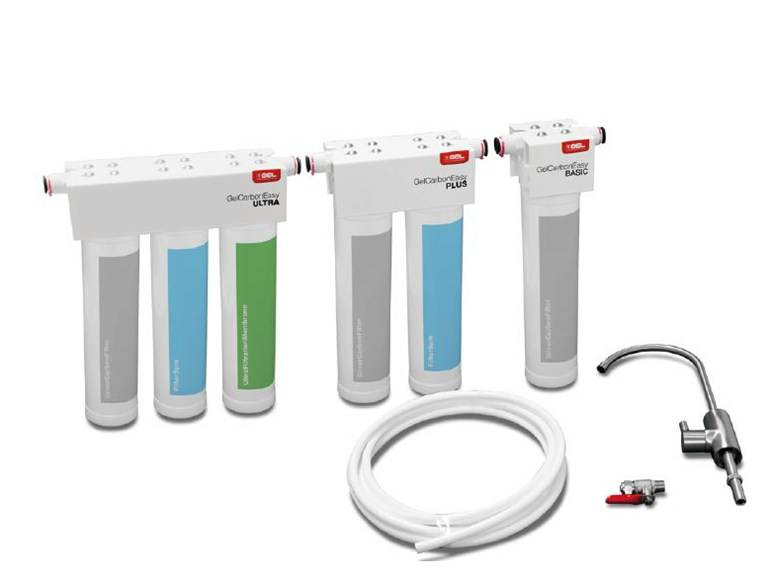 Sistema di filtrazione a carbone attivo, con grado di filtrazione pari a 0,5 micron, in grado di migliorare la qualità dell'acqua del rubinetto rendendola ottima per bere e cucinare. Gelpur Easy Carbon eroga acqua priva di: