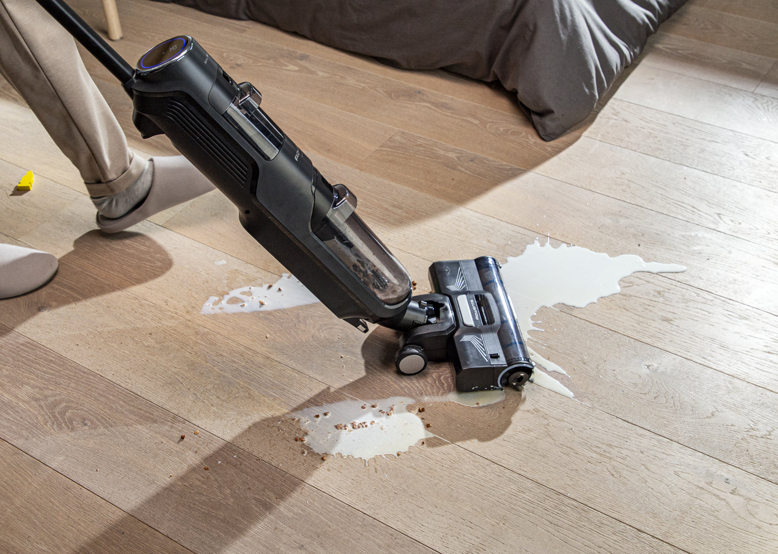 La spazzola laterale pulisce con precisione nei bordi, lungo i battiscopa e negli angoli, per una pulizia accurata anche nelle zone più difficili da raggiungere.