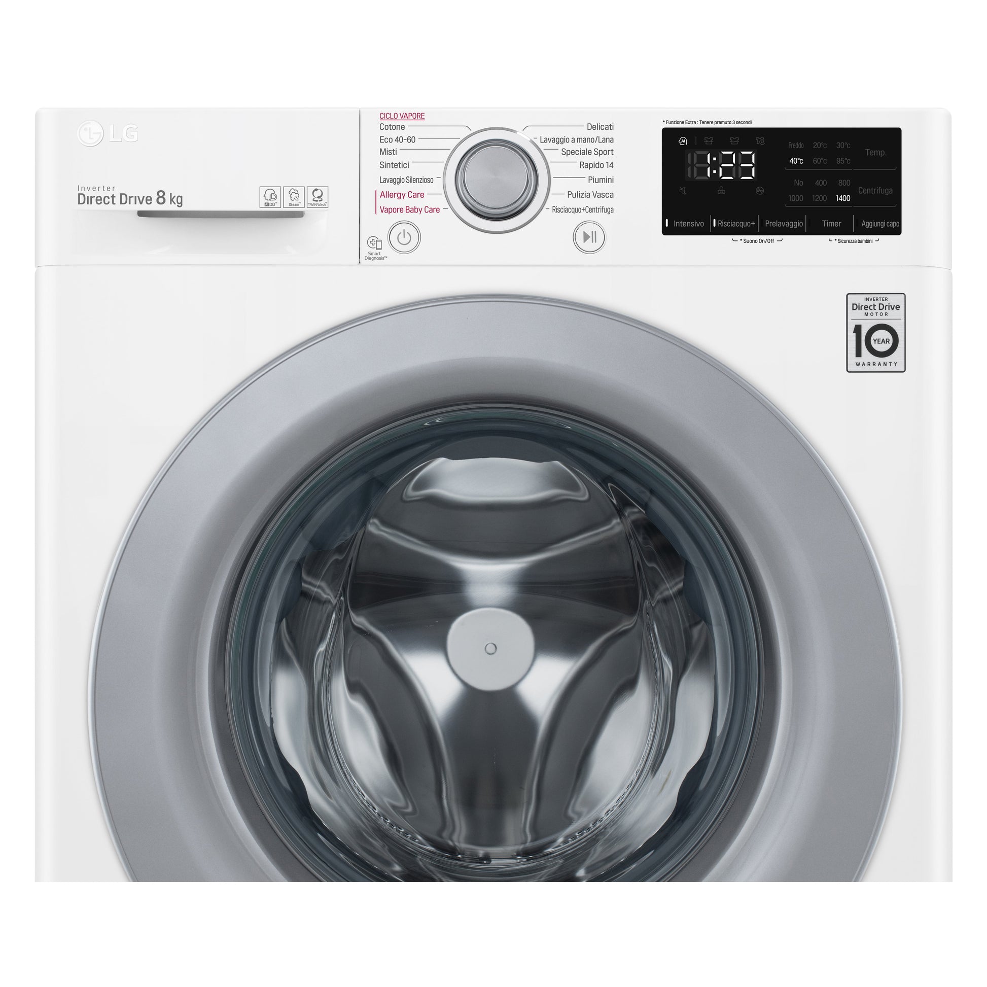 Programmi: Cotone, Sintetici, Lana, Delicati/Seta, Allergy Care, Piumone, Sport, Vapore, Silent, Intenso, Baby Care, Eco, Prelavaggio, Risciacquo & centrifuga, Rapido