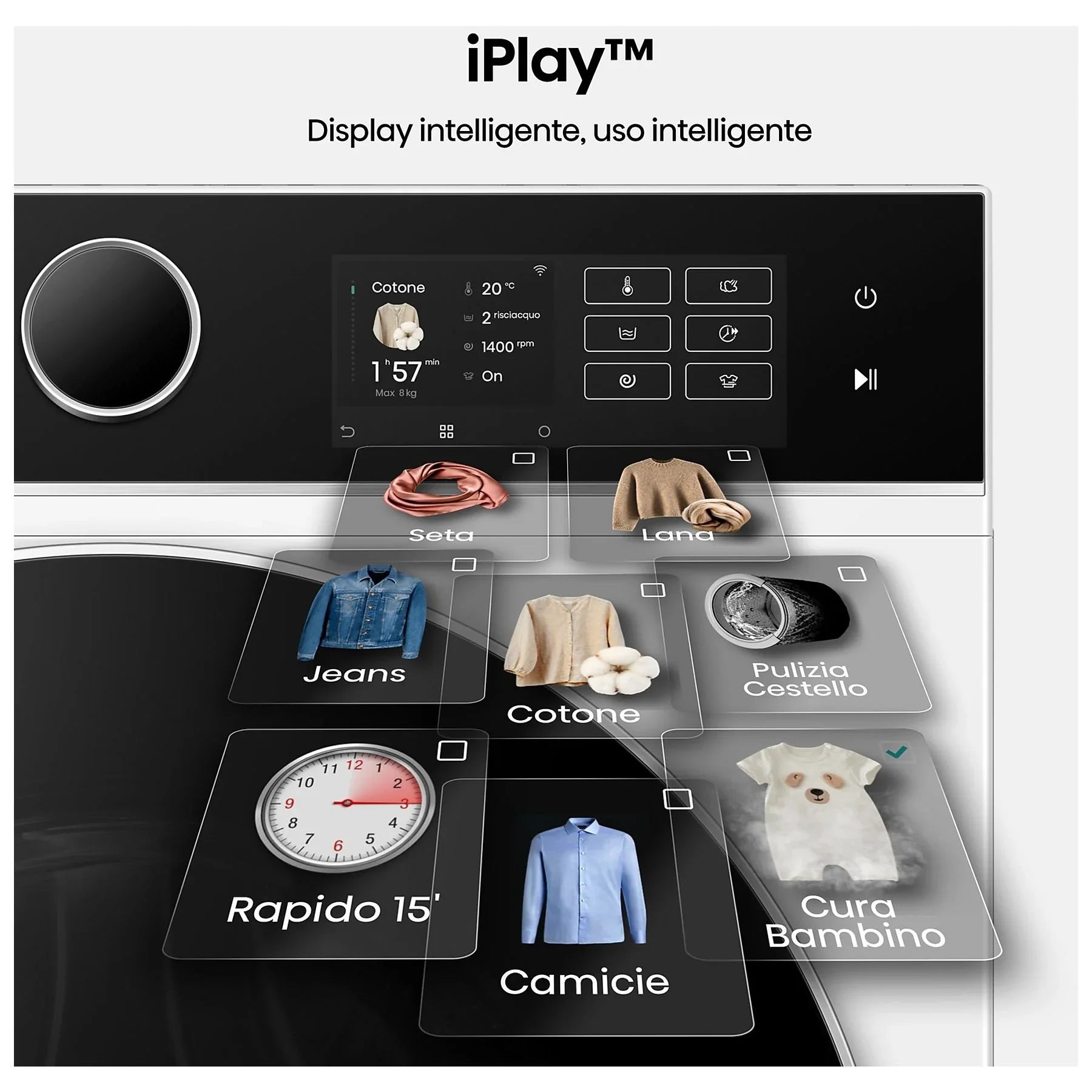 Lo schermo TFT da 3,55 pollici di iPlay ™migliora la tua routine di lavanderia con colori vivaci e una chiarezza sorprendente. Illustra chiaramente i cicli e le funzioni, consentendo una selezione intuitiva delle impostazioni tramite manopola o touchscreen. Goditi un controllo intuitivo e un design elegante e moderno.
