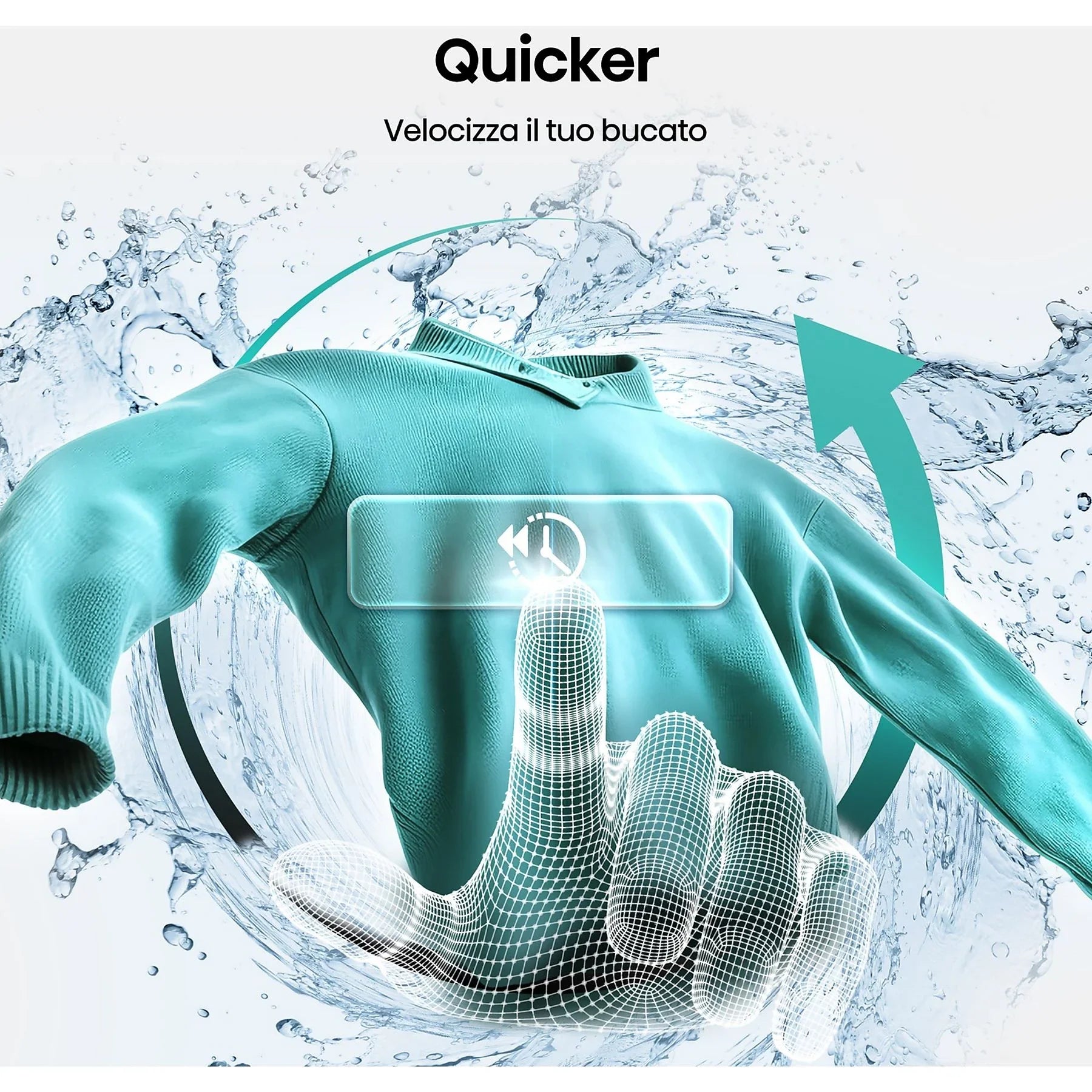 La funzione "Quicker" consente di risparmiare fino al 57% del tempo di lavaggio abbreviando il ciclo di lavaggio. È sufficiente cliccare per avviare Quicker e, ogni volta che viene selezionata, il tempo di lavaggio viene ulteriormente ridotto. Goditi una pulizia rapida senza compromettere la qualità, ideale per i giorni in cui hai bisogno di fare il bucato velocemente ma desideri risultati ottimali.