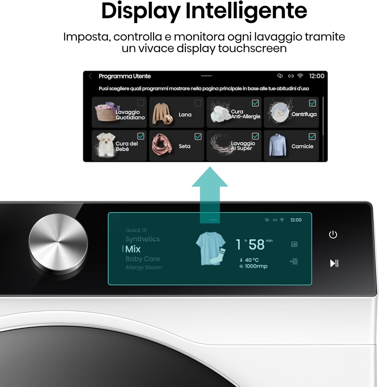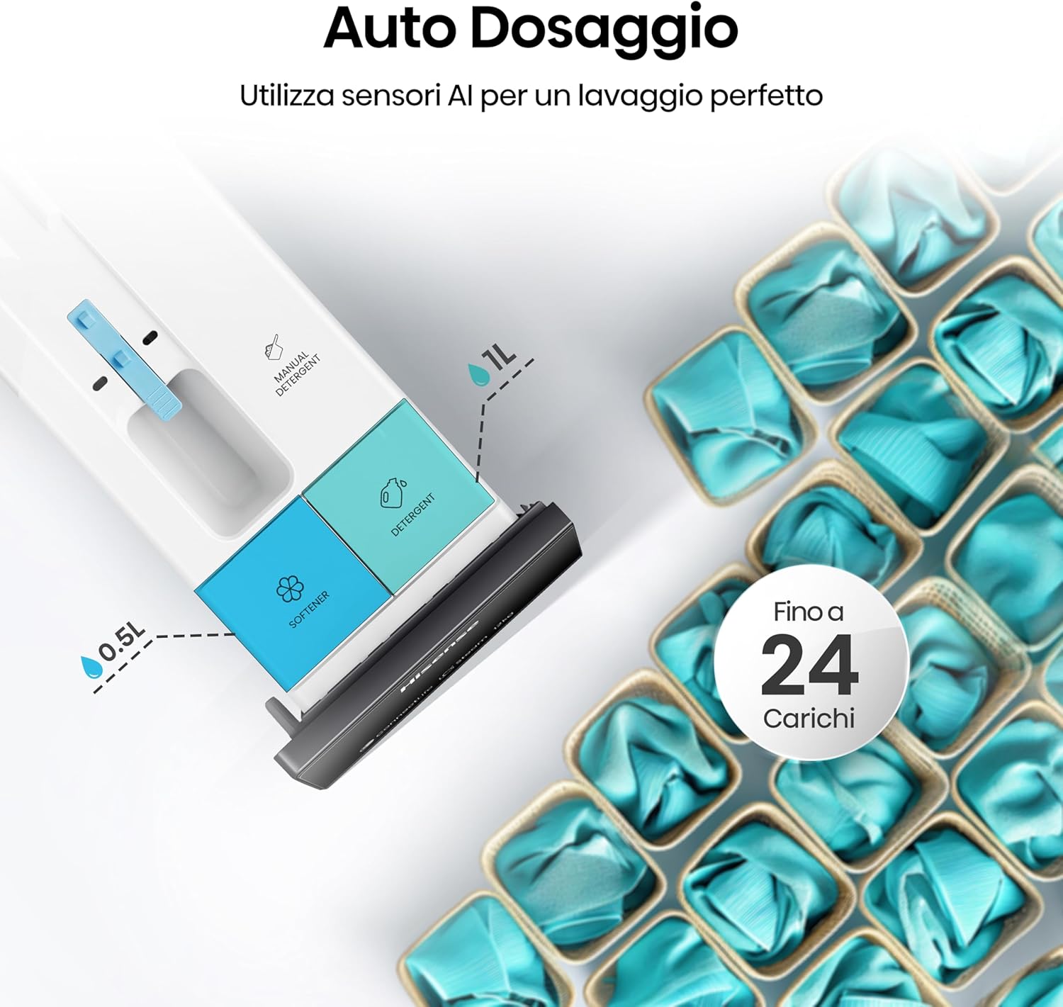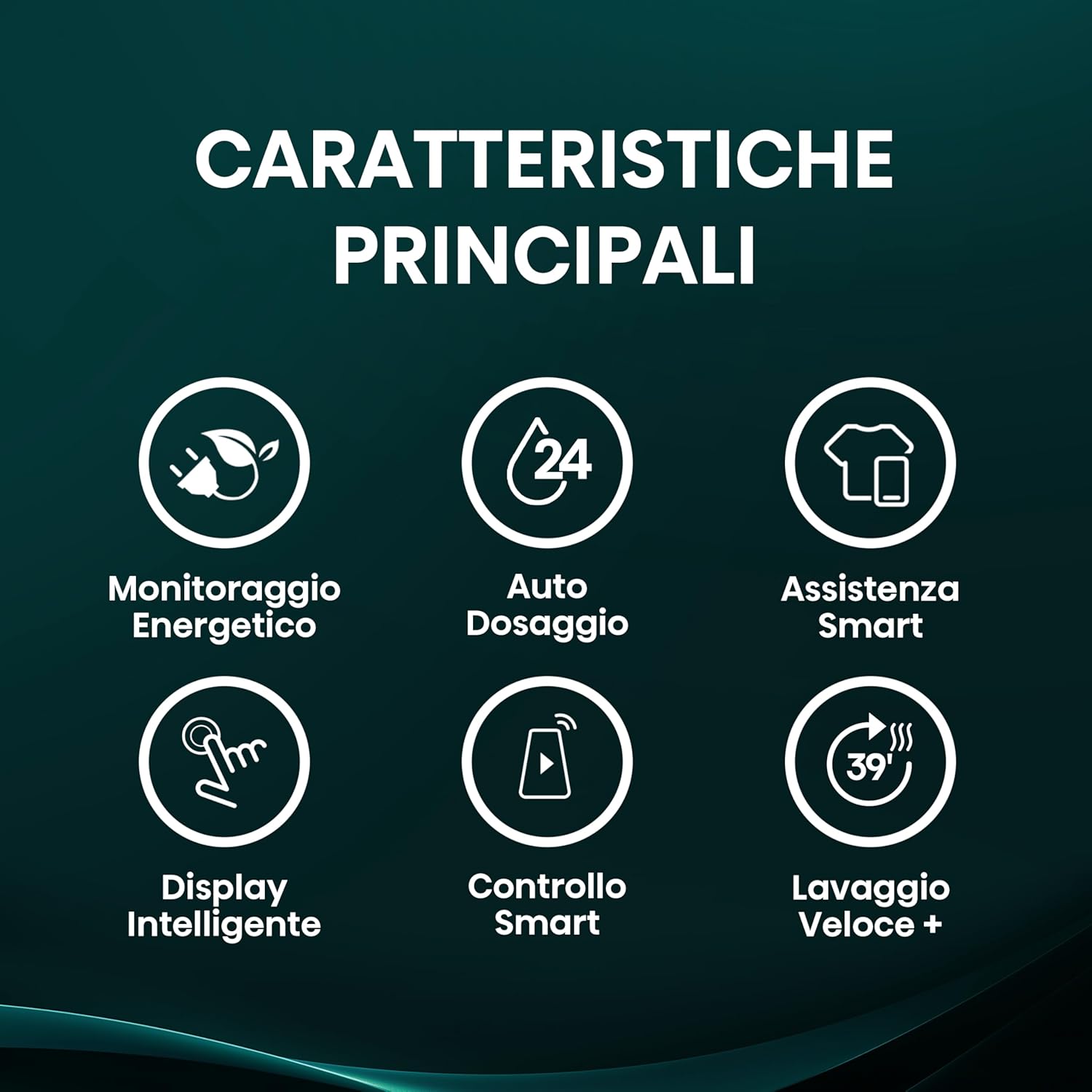 Tecnologie Hisense: Allergy Care, Auto Dose, ConnectLife, Hygiene Guard, Motore inverter, Pause & Add, PureJet, Lavaggio rapido, Vapore