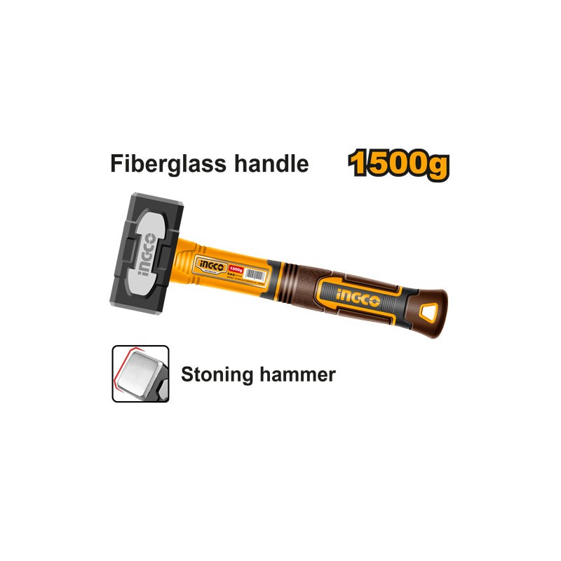Mazza Ingco professionale da 1500 gr in acciaio al carbonio e impugnatura soft grip e struttura in fibra di vetro; Peso testa: 1500 gr; Acciaio al carbonio; Trattamento al calore; Impugnatura in fibra di vetro.