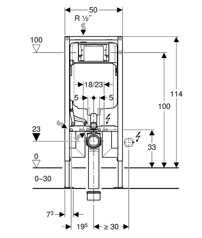 - Rofondità della piastra di base, adatta all'installazione in profili a U UW 50 e binari del sistema Geberit Duofix