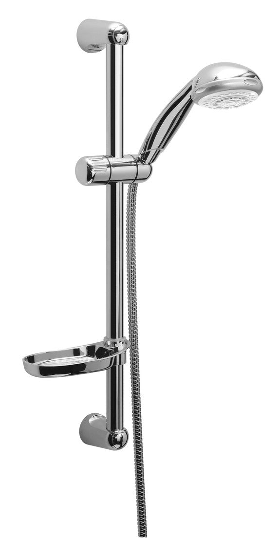 saliscendi doccia composto da asta 125CR inox cromato Ø 25 mm, laterali con placchetta cromata e scorrevole in ABS cromato, doccia Dolly3 in ABS cromato con anticalcare 3 getti, portasapone Vela cromato e flessibile 150 cm doppia aggraffatura. Fissaggio a 1 vite per ogni laterale, 575 mm