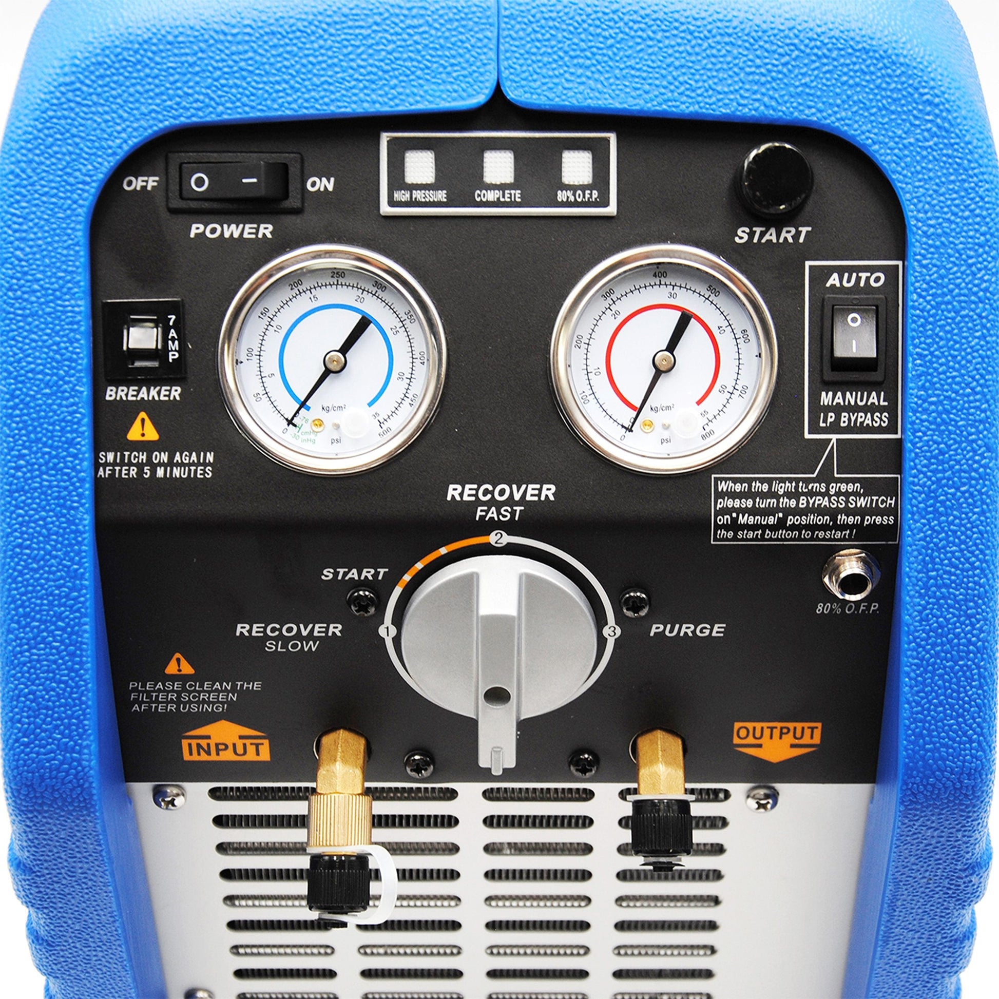 Stazioni di recupero Mod. REC-24 e REC-24 COMPACT equipaggiate con due manometri a secco, uno sulla linea di aspirazione e uno sulla linea di scarico, che permettono il controllo delle pressioni durante le operazioni di recupero e trasferimento del refrigerante con metodo PUSH-PULL.
